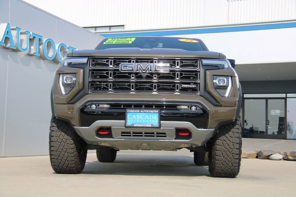 *One Owner*, Accident Free Carfax, Alloy Wheels, Audio Package, Backup Camera, Bi Xenon Headlamp Package, Bluetooth, Bose High End Sound Package, Cargo Package, Climate Package, Heat Package, Heavy Duty Trailer Package, Leather Seats, Multimedia Package, Navigation System, Off Road Package, Performance Handling Package, Power Mirror Package, Power Package, Premium Audio Package, Premium Wheels, Rear Climate Package, Remote Start, Safety Package, Security Package, Sunroof/Moonroof, Technology Package, Tow Package, Wood Trim Package, Canyon AT4X, 4D Crew Cab, 2.7L I4 Turbocharged DOHC 16V LEV3-SULEV30 310hp, 8-Speed Automatic, 4WD, Deep Bronze Metallic, Obsidian Rush Leather, 120-Volt Bed Mounted Power Outlet, 2 1st Row USB Charge/Data Ports, 2 Rear USB Ports in Center Console (Charge-Only), 220 Amps Alternator, 3.42 Rear Axle Ratio, 4-Wheel Disc Brakes, 6-Way Power Passenger Seat Adjuster, 7 Speakers, 8-Way Power Driver Seat Adjuster, ABS brakes, Adaptive Cruise Control, Air Conditioning, Alloy wheels, AM/FM radio, Apple CarPlay/Android Auto, Auto High-beam Headlights, Auto-dimming Rear-View mirror, Automatic Emergency Braking, Automatic Stop/Start, Automatic temperature control, Brake assist, Bumpers: body-color, Canyon Pro Safety, Compass, Delay-off headlights, Driver & Front Passenger Illuminated Visors, Driver & Front Passenger Ventilated Seats, Driver door bin, Driver Memory, Driver Mode Selector, Driver Seatback Map Pocket, Driver vanity mirror, Driver-Selectable Full-Locking Front Differential, Driver-Selectable Full-Locking Rear Differential, Dual front impact airbags, Dual front side impact airbags, Dual-Zone Automatic Air Conditioning, Electronic Stability Control, Engine Block Heater, EZ-Lift & Lower Tailgate, Following Distance Indicator, Forward Collision Alert, Front anti-roll bar, Front Bucket Seats, Front Center Armrest, Front dual zone A/C, Front fog lights, Front LED Fog Lamps, Front Passenger Seatback Map Pocket, Front Pedestrian & Bicyclist Braking, Front reading lights, Front wheel independent suspension, HD Surround Vision, Heads-Up Display, Heated door mirrors, Heated Driver & Front Passenger Seats, Heated front seats, Heated Power-Adjustable Outside Mirrors, Heated Steering Wheel, Heated steering wheel, Illuminated entry, Inside Rear-View Auto-Dimming Mirror, Integrated Trailer Brake Controller, IntelliBeam Automatic High Beam On/Off, Interior Overhead Courtesy Light w/Dual Reading Lamp, Lane Keep Assist w/Lane Departure Warning, Low tire pressure warning, Manual Rear-Sliding Window, Memory seat, Multicolor 6.3 Diagonal Head-Up Display, MultiStow Tailgate, Navigation system: OnStar, Occupant sensing airbag, Outside temperature display, Overhead airbag, Overhead console, Panic alarm, Passenger door bin, Passenger vanity mirror, Perforated Leather-Appointed Seat Trim, Power door mirrors, Power Driver Lumbar Control Seat Adjuster, Power driver seat, Power Inner Sliding Glass Sunroof w/Manual Shade, Power Passenger Lumba